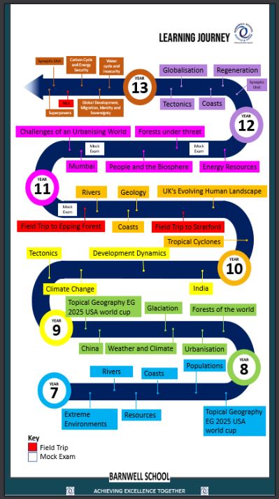 Our Geography curriculum gives students a well-rounded idea of the world that we live in by looking at physical and human geography topics, both nationally within the UK and internationally across the globe. The fieldwork element allows students to make real life connections by being immersed with hands on visual and practical experience, helping them to learn and understand.